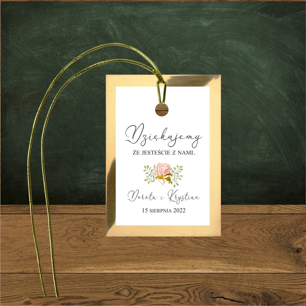 Podziękowania dla gości najmodniejsze są personalizowane, dlatego nieodzowne będą zawieszki do zawiązania prezencików. Te tutaj z zielonymi gałązkami i pastelowymi różowymi piwoniami.Dla wielbicieli przepychu w wersji glamour ze złotą podklejką.