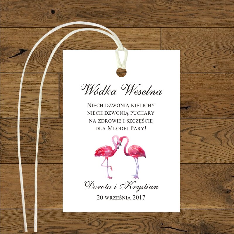 Zaproszenia ślubne z flamingami na złotym kartoniku. Flamingi