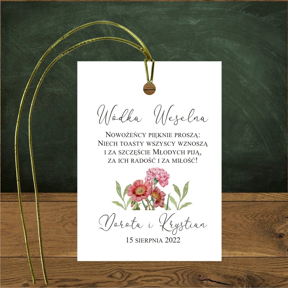 Oryginalne zawieszki na wódkę weselną będą niezwykłą ozdobą stołu weselnego, szczególnie dopasowane stylistyką do reszty papeterii ślubnej. Niezwykły rustykalny wzór z różowych piwonii i karminowych goździków.