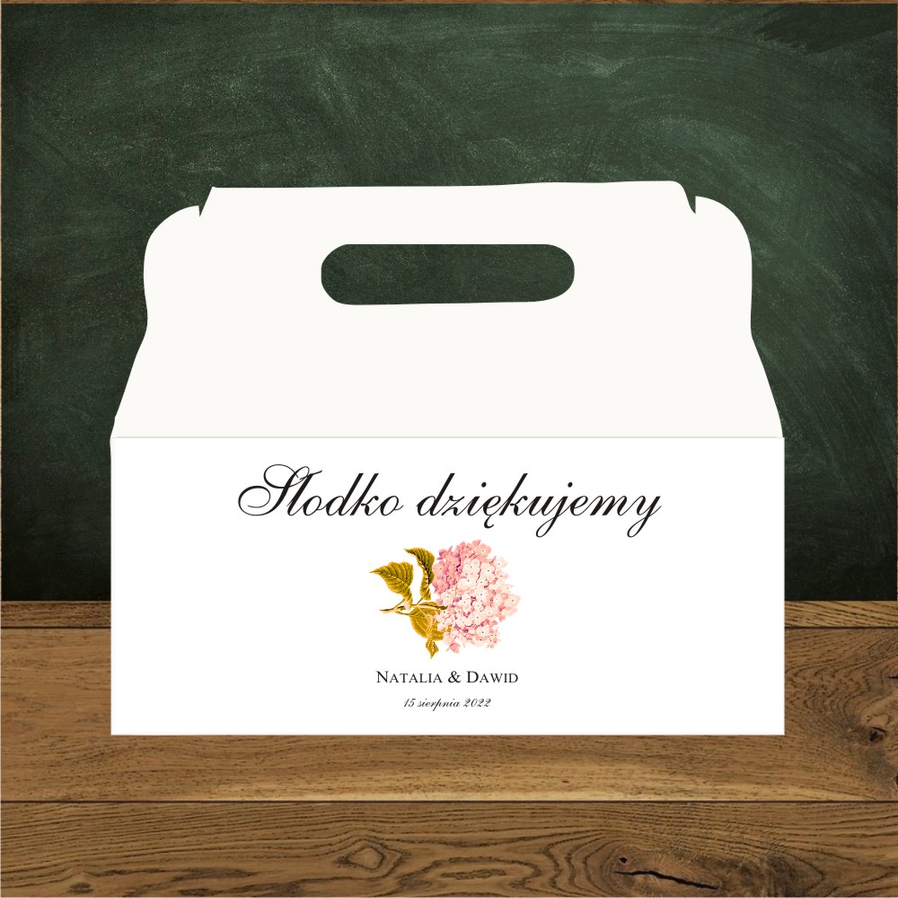 Pudełko na ciasto weselne z różowym kwiatem hortensji.