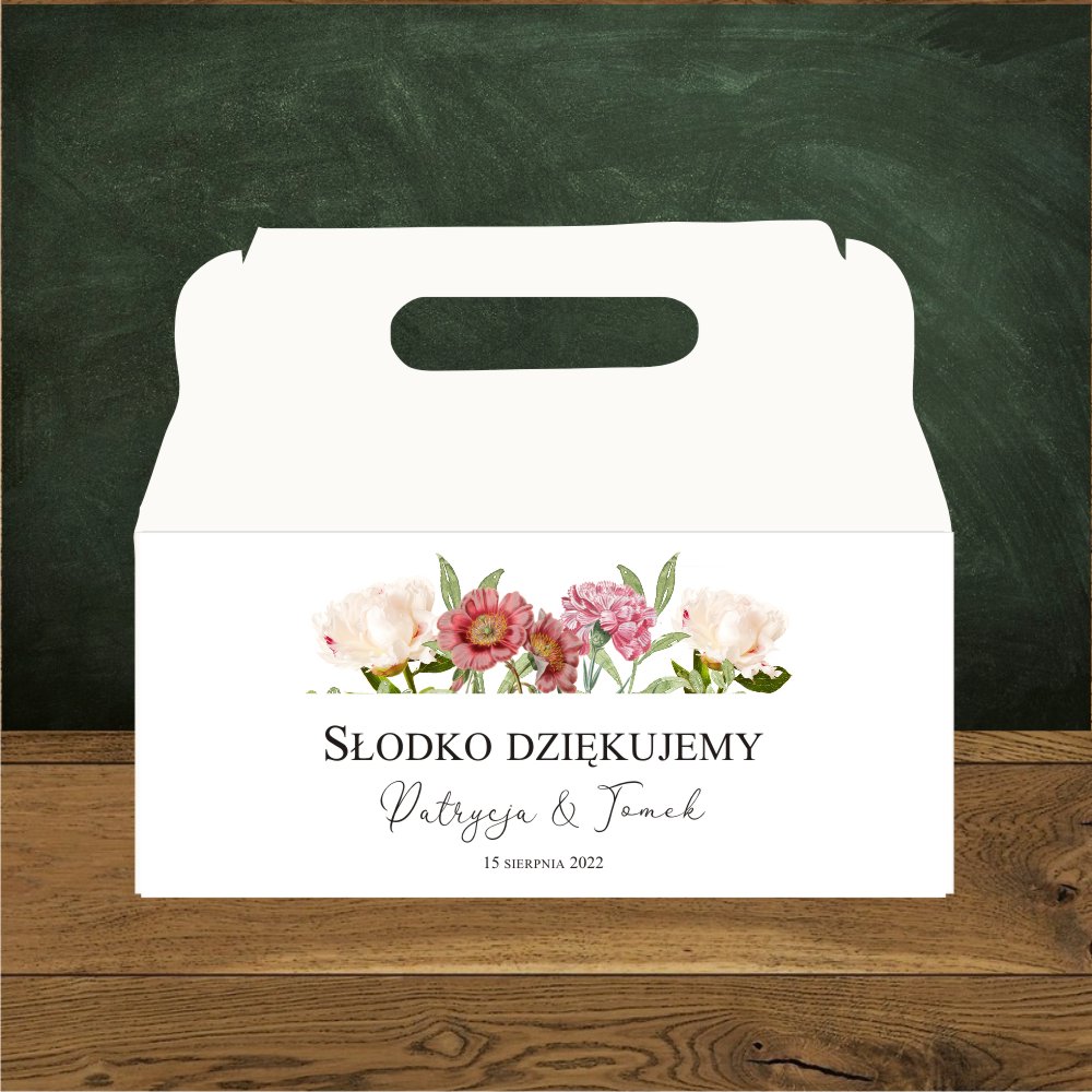 Pudełko na tort weselny wręczone na koniec przyjęcia to piękna tradycja obdarowywania, szczególnie jeśli opakowanie jest personalizowane i dopasowane stylistyką do innych dodatków ślubnych.Tu piękne piwonie i gerbery.