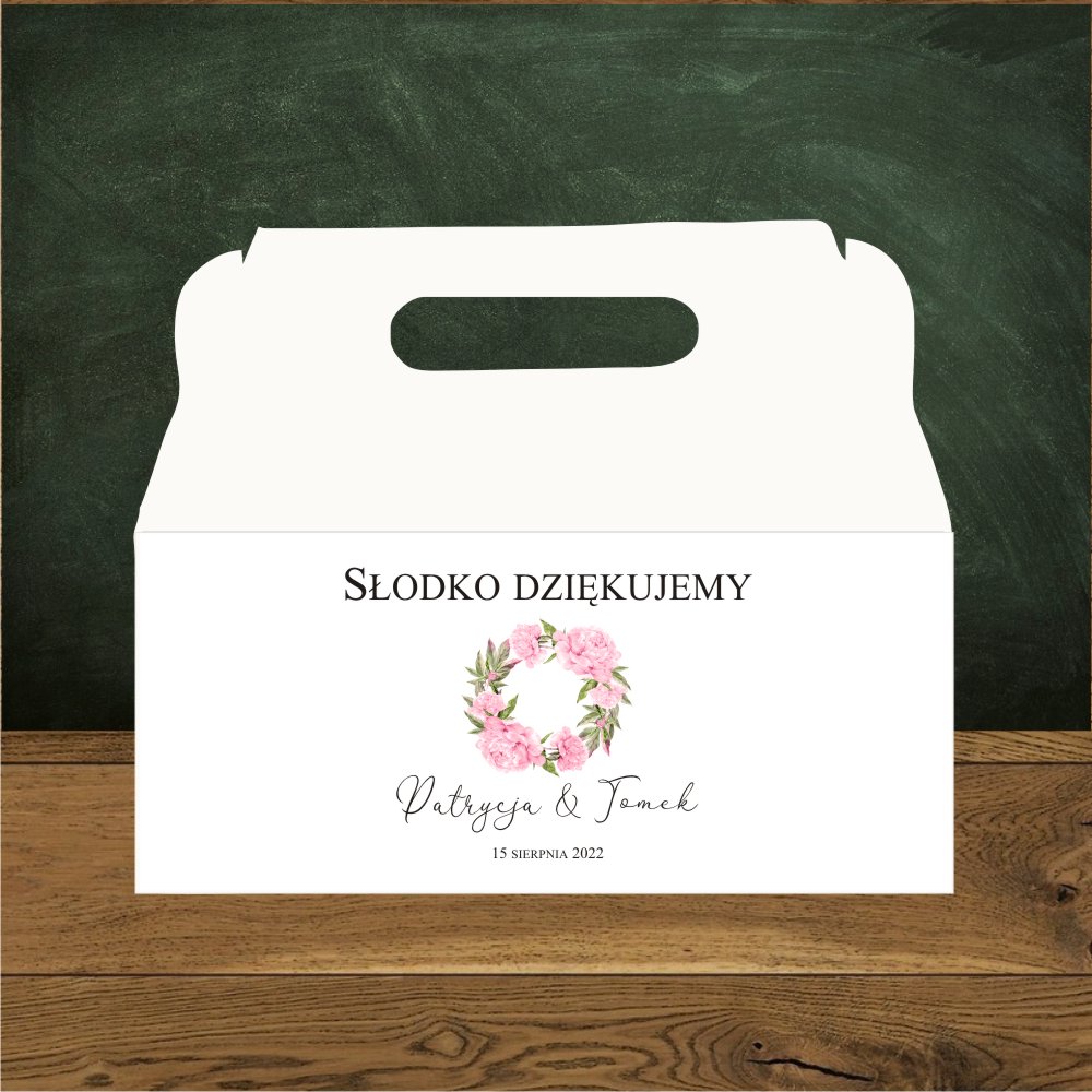 Pudełko na tort weselny wręczone na koniec przyjęcia to piękna tradycja obdarowywania, szczególnie jeśli opakowanie jest personalizowane imionami Państwa Młodych oraz rustykalnym wiankiem z różowych piwonii.