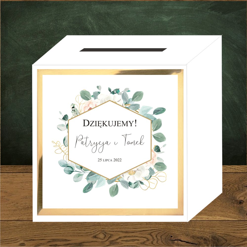 Zaproszenie ślubne zielone złote eukaliptus i heksagon