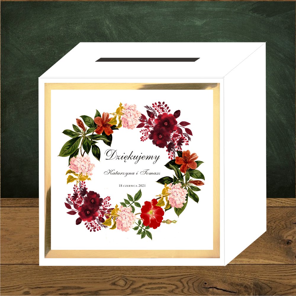 Front do pudełek na koperty. Kwiaty bordo w wianku