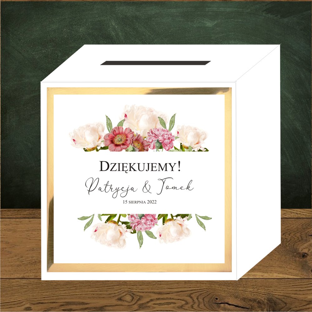 Zaproszenia ślubne boho z elementami glamour. Kwadratowe, złoty mirror. Kwiaty romantyczny ogród i gożdzik