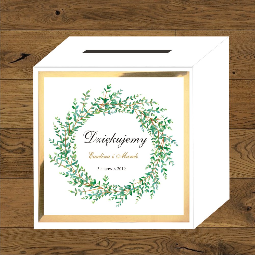 Front do pudełek na koperty Wianek zielone gałązki - papier złoty mirror