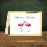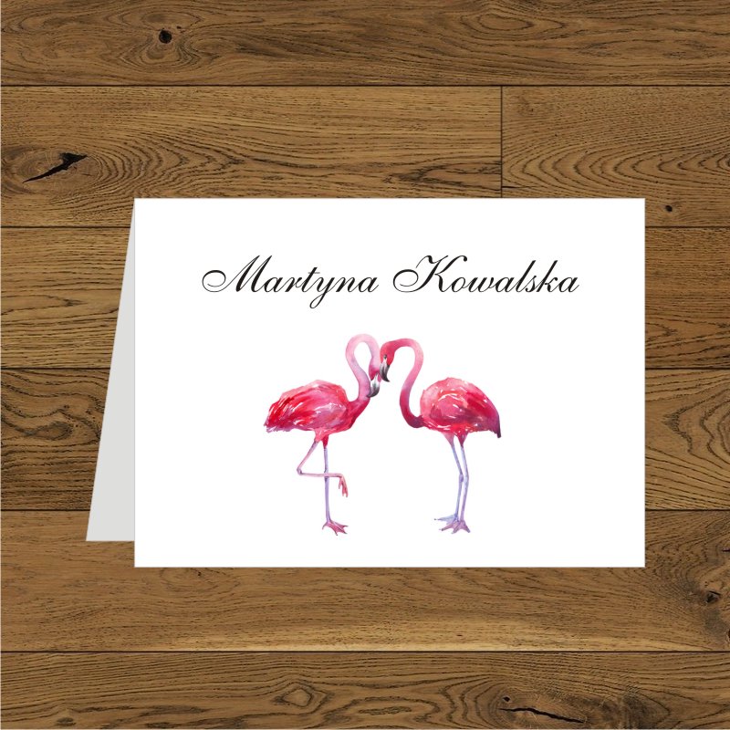 Zaproszenia ślubne z flamingami na złotym kartoniku. Flamingi