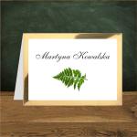 Zaproszenia minimalistyczne rustykalne z zielonym lisciem paproci. Kwadratowe na złotym kartoniku. Paprotka