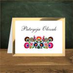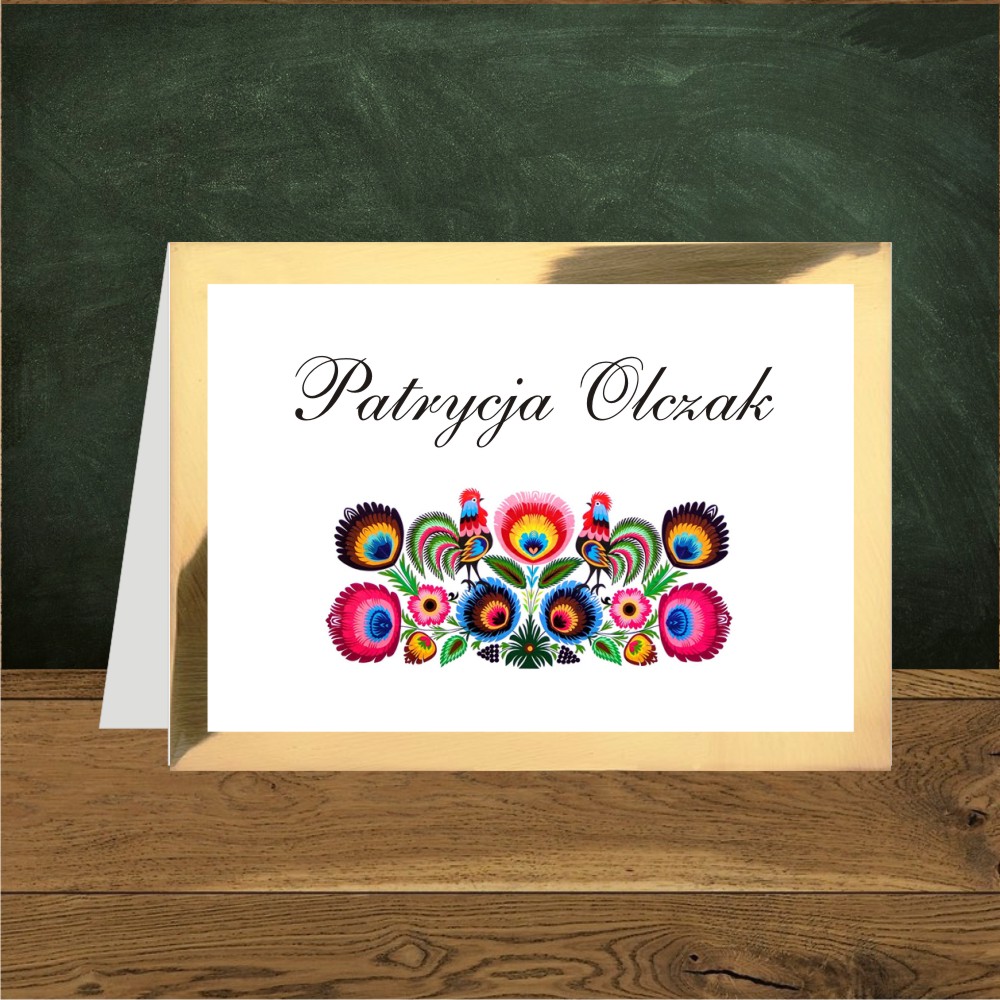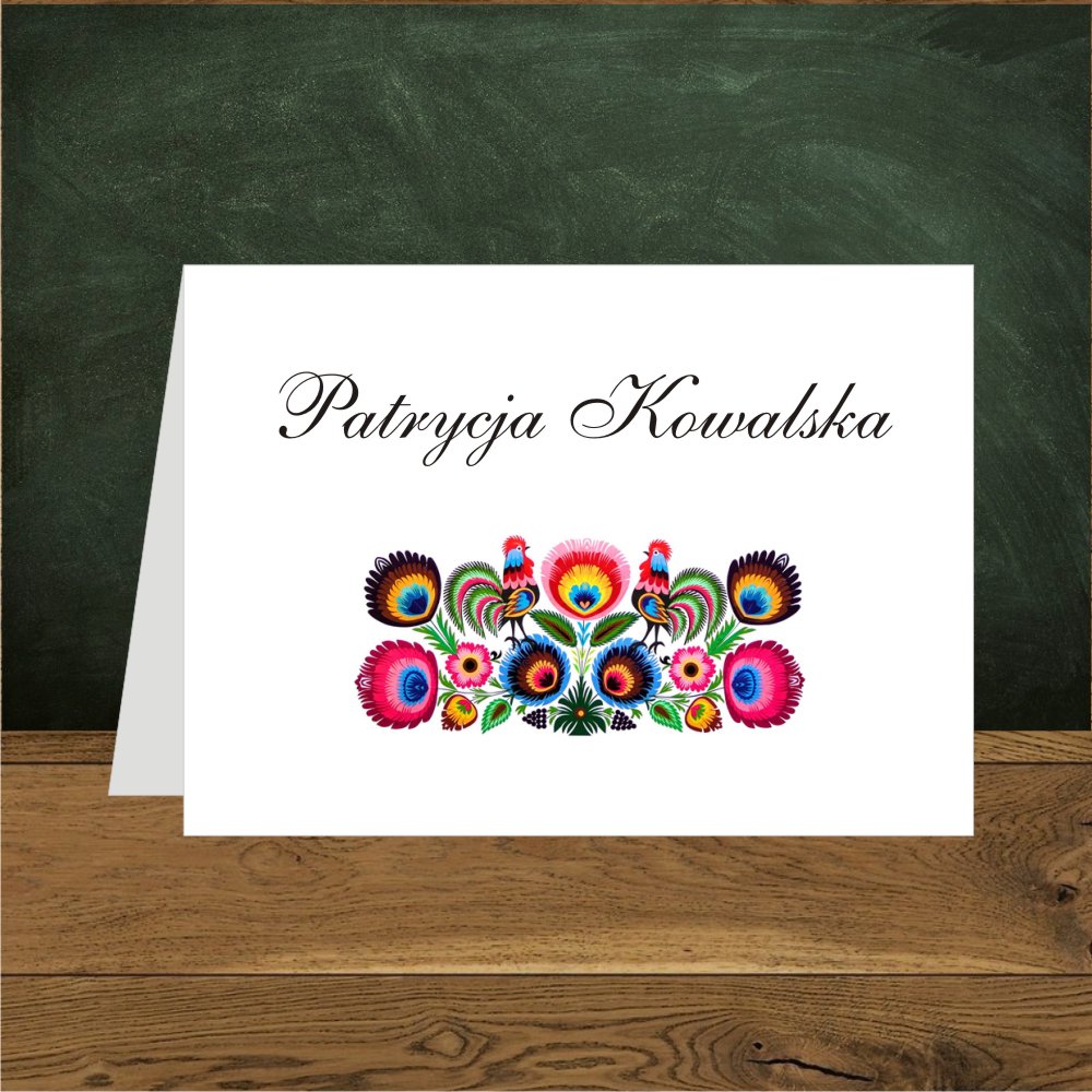 Wizytówka ślubna ustawiona na stole spełnia kilka funkcji, organizacyjnych i przede wszystkim jest ozdobą.Prezentowana tutaj w folkowym stylu.