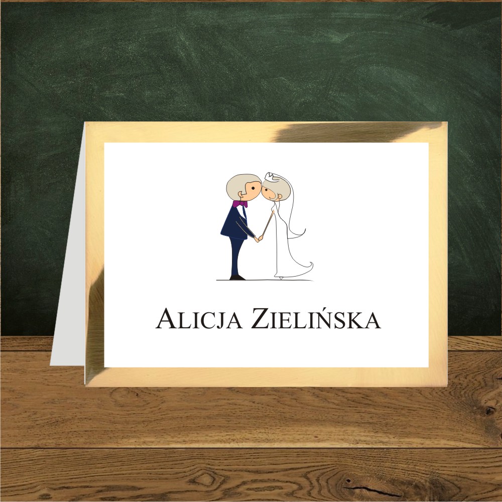 Winietka ślubna ustawiona na stole spełnia kilka funkcji organizacyjnych i przede wszystkim jest ozdobą. Prezentowana tutaj przedstawia humorystycznie Parę Młodą.