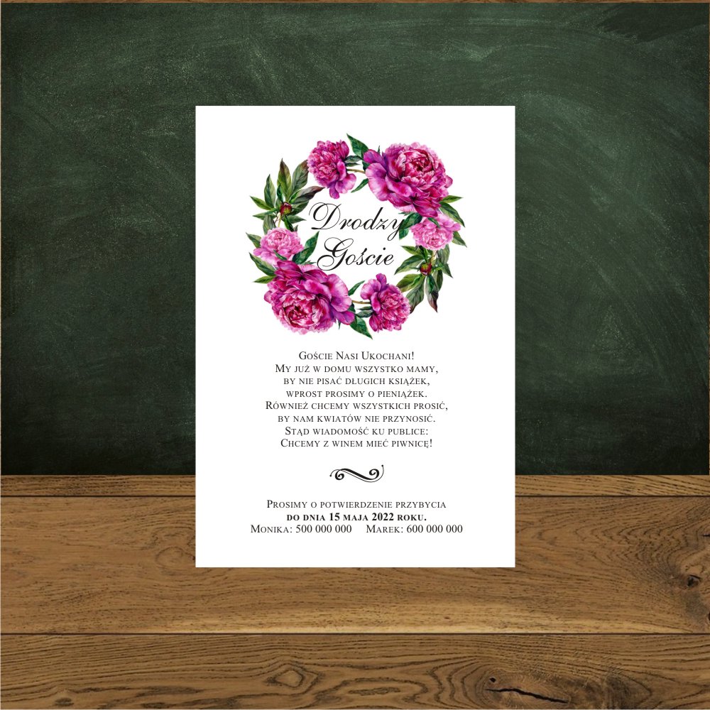 Ekskluzywne zaproszenia slubne piwonie wianek fuksja. Zaproszenie w kolorach złota i fuksji