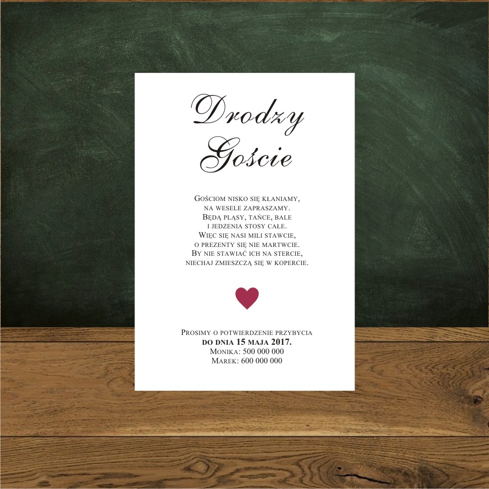 Zaproszenia weselne minimalistyczne z serduszkiem bordowym