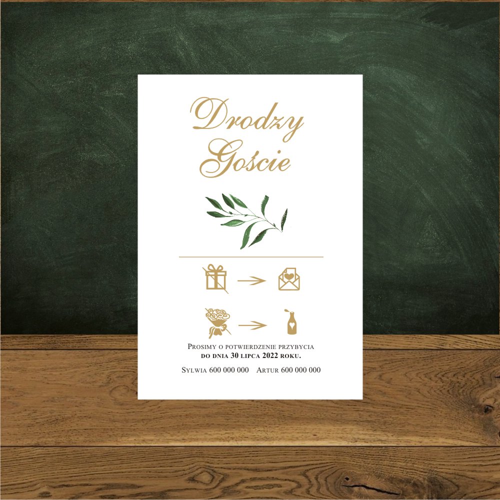 Zaproszenia ślubne rustykalne z zielonymi gałązkami na kortoniku złotym mirror. Zielone gałązki delikatne