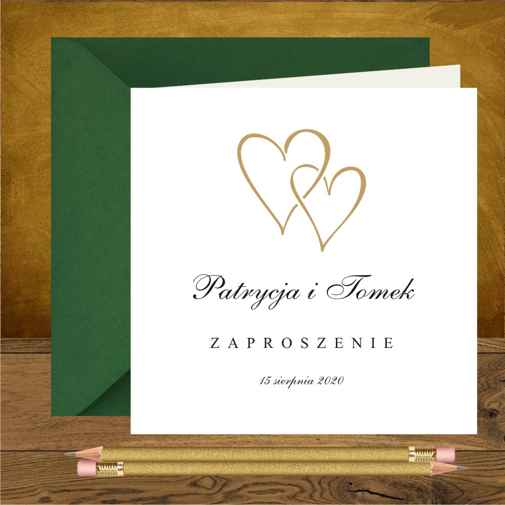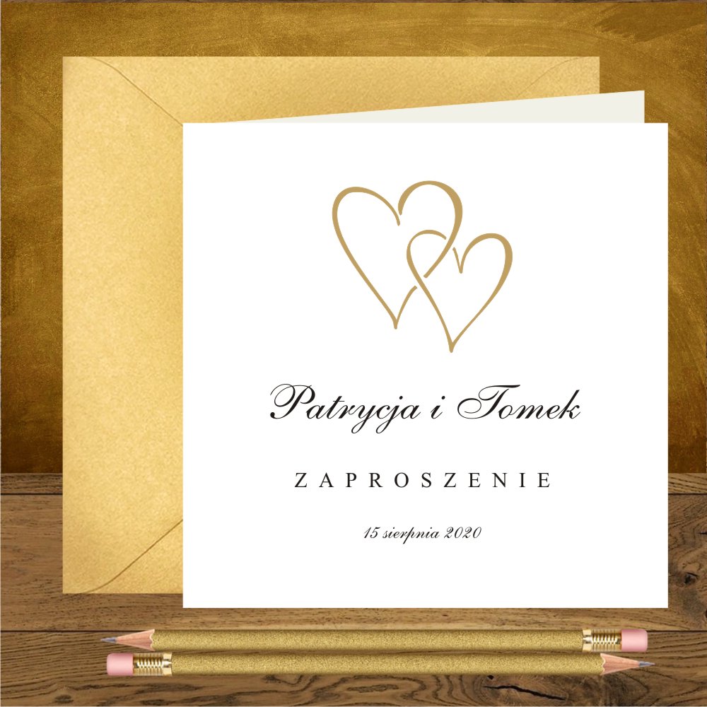 Zaproszenia ślubne minimalistyczne z dwoma złotymi serduszkami