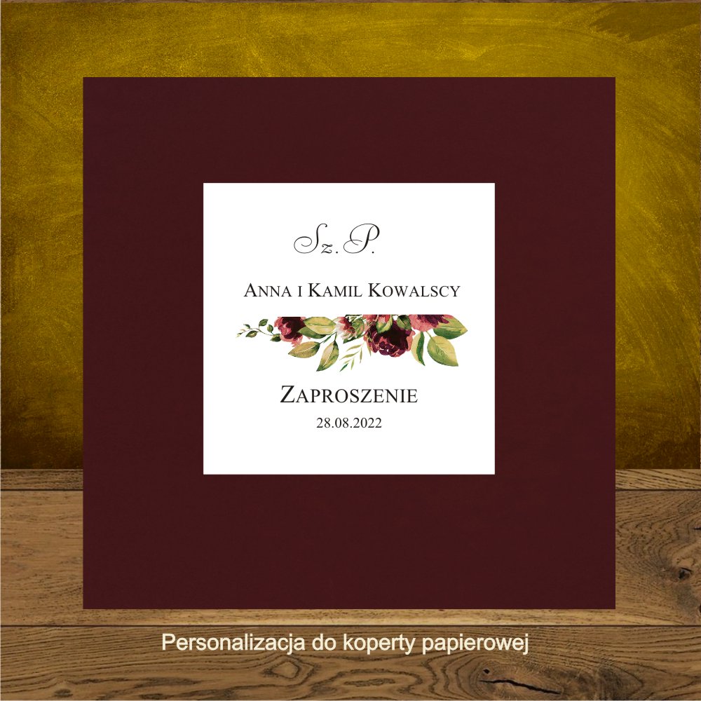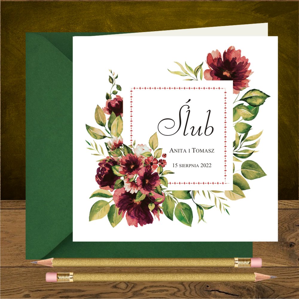 Opis: zaproszenia wykonane z papieru białego. Na froncie zielone listki i kwiaty w kolorystyce bordo ułożone w iryginalny sposób. Zaproszenie idealne na wesela w stylistyce boho, rustykalnej. Zaproszenia kwiatowe to bardzo modny trend w zaproszeniach ślubnych ostatnich lat.