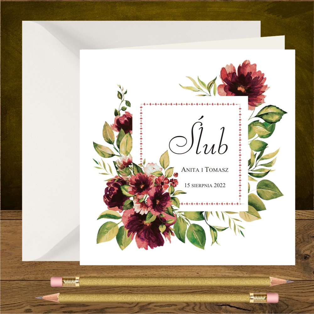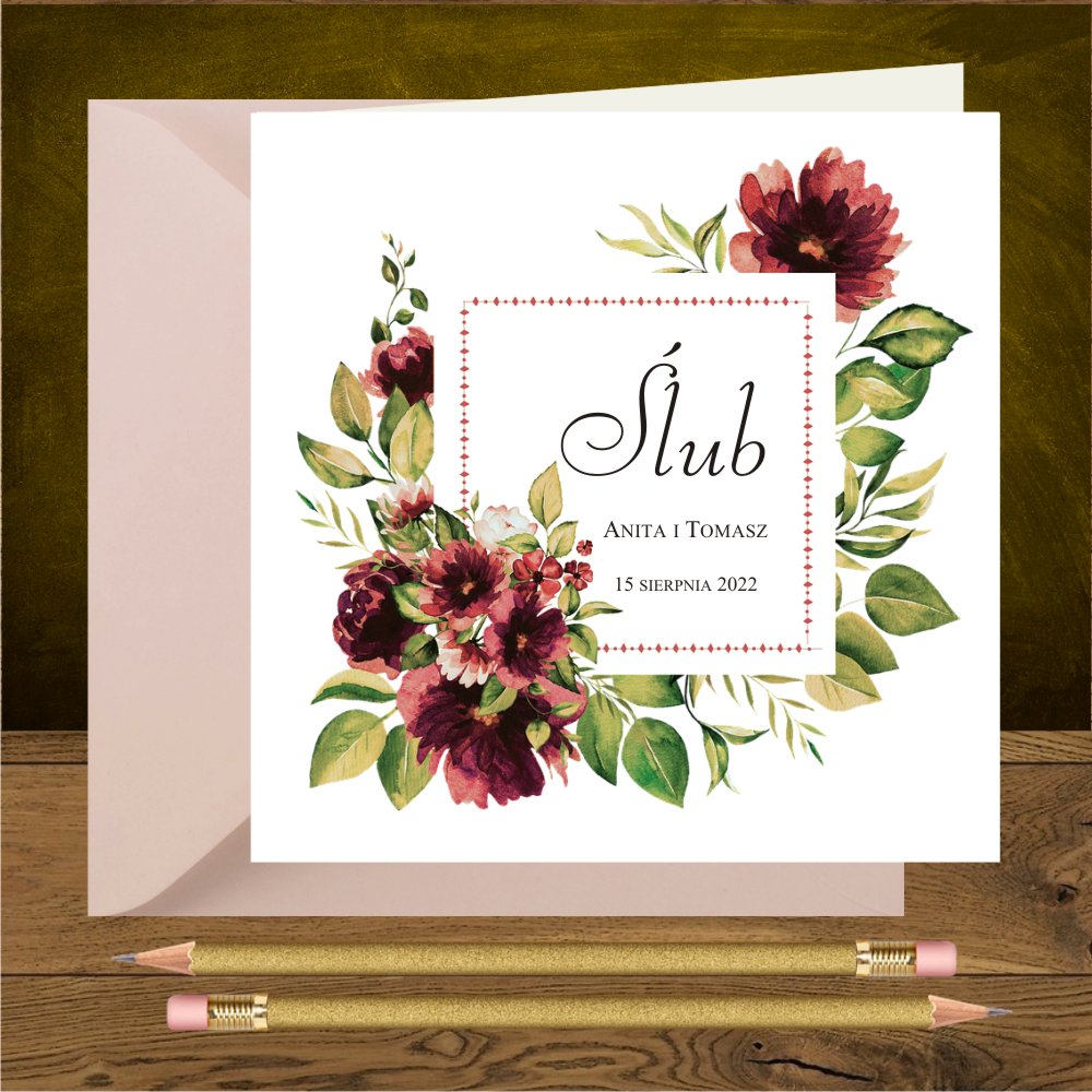 Orginalne zaproszenia na ślub z kwiatami bordowymi. Kwiaty bordo i gałązki