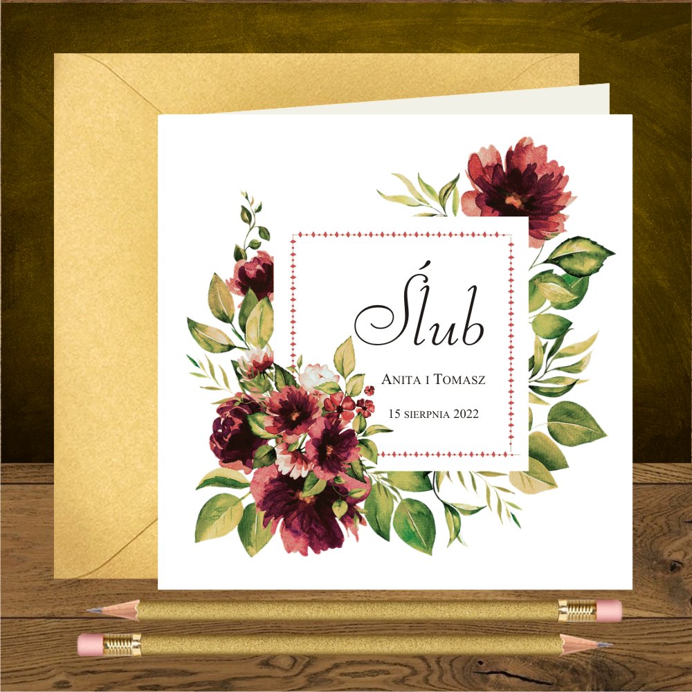 Zaproszenia ślubne kwiatowe złoto bordowe. Kwiaty bordo i gałązki
