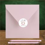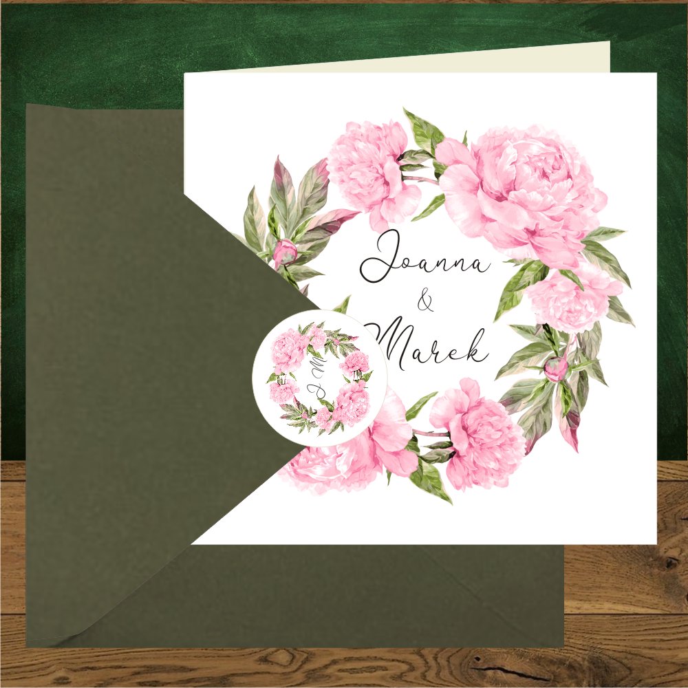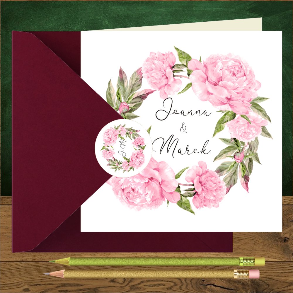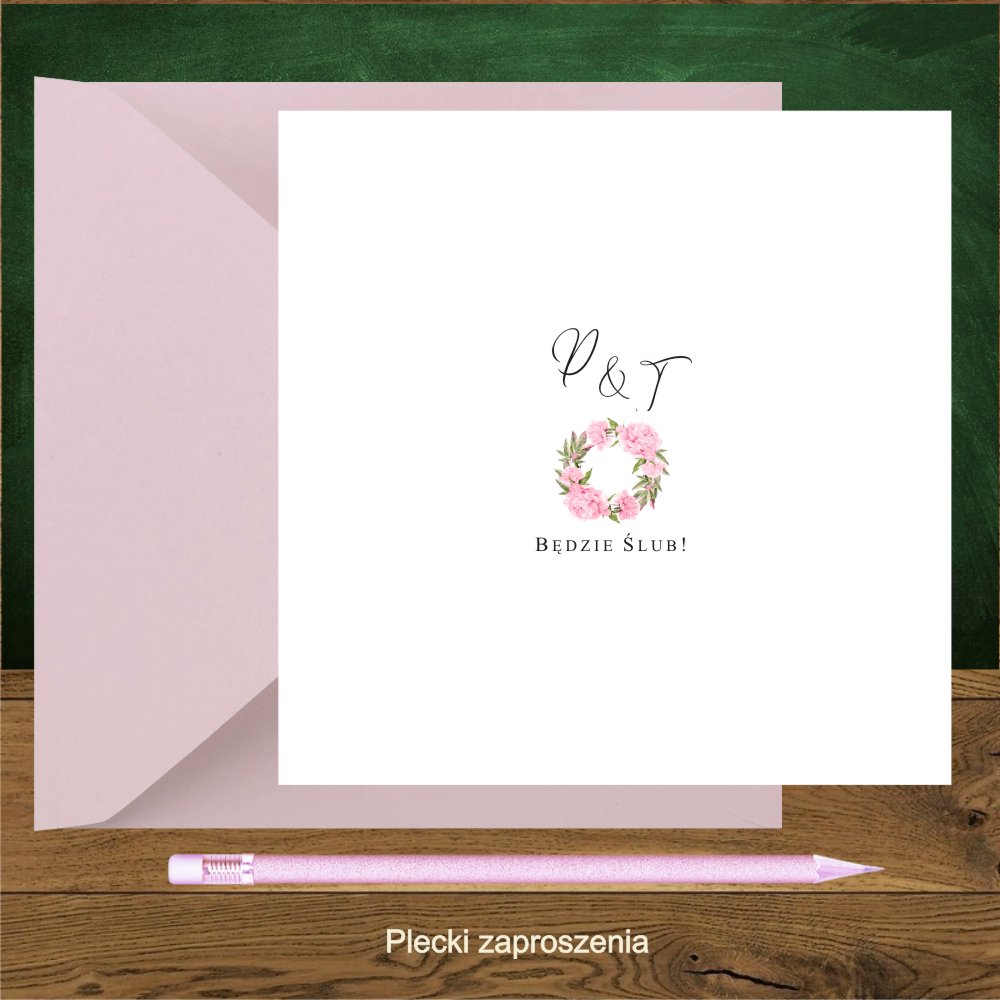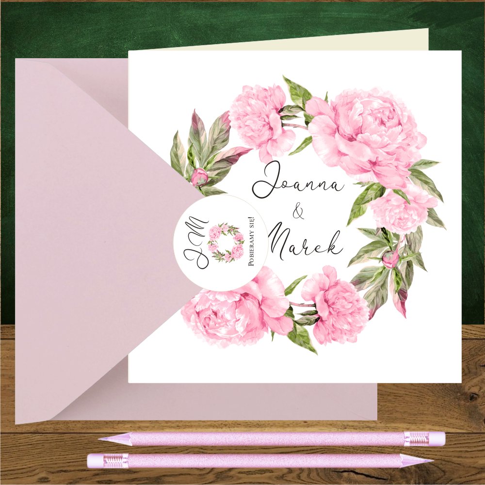 Piękne zaproszenie na wesele z różowymi piwoniami w wianku z nowoczesną ozdobną czcionką. Na pleckach zaproszenia inicjały i wianuszek kwiatów piwonii. Wyjątkowo korzystnie to kwiatowe zaproszenie przezentuje się z różową kopertą tworząc romantyczny styl.
