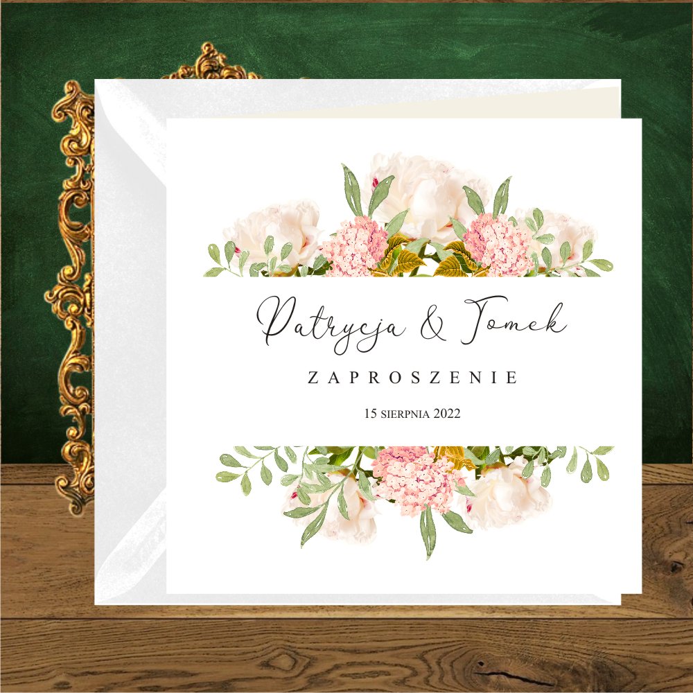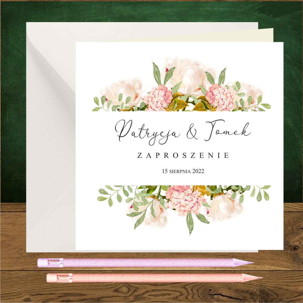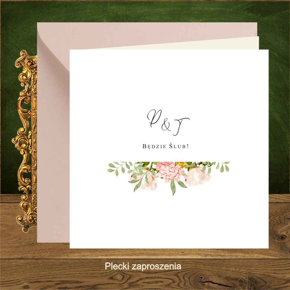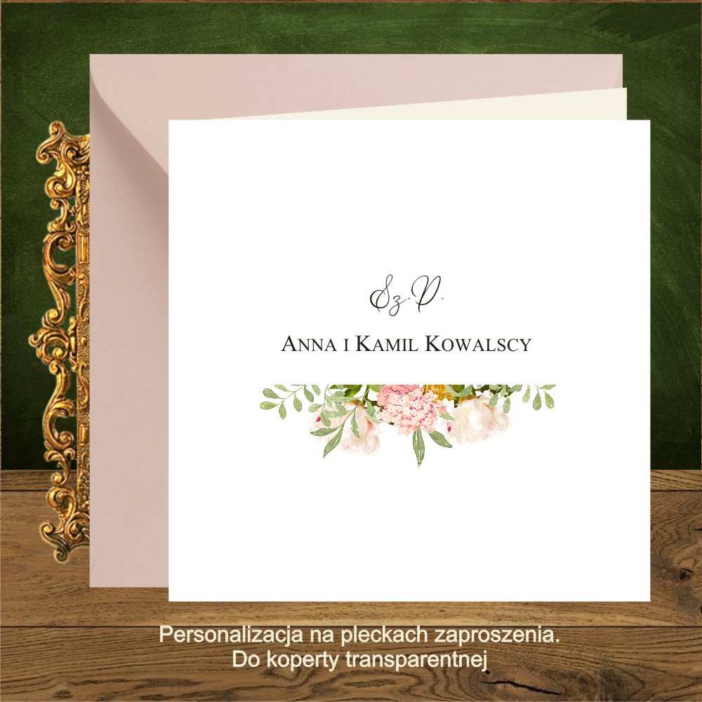 Zaproszenia na ślub i wesele z pastelowymi kwiatami. Kwadratowe, proste. Kwiaty romantyczny ogród