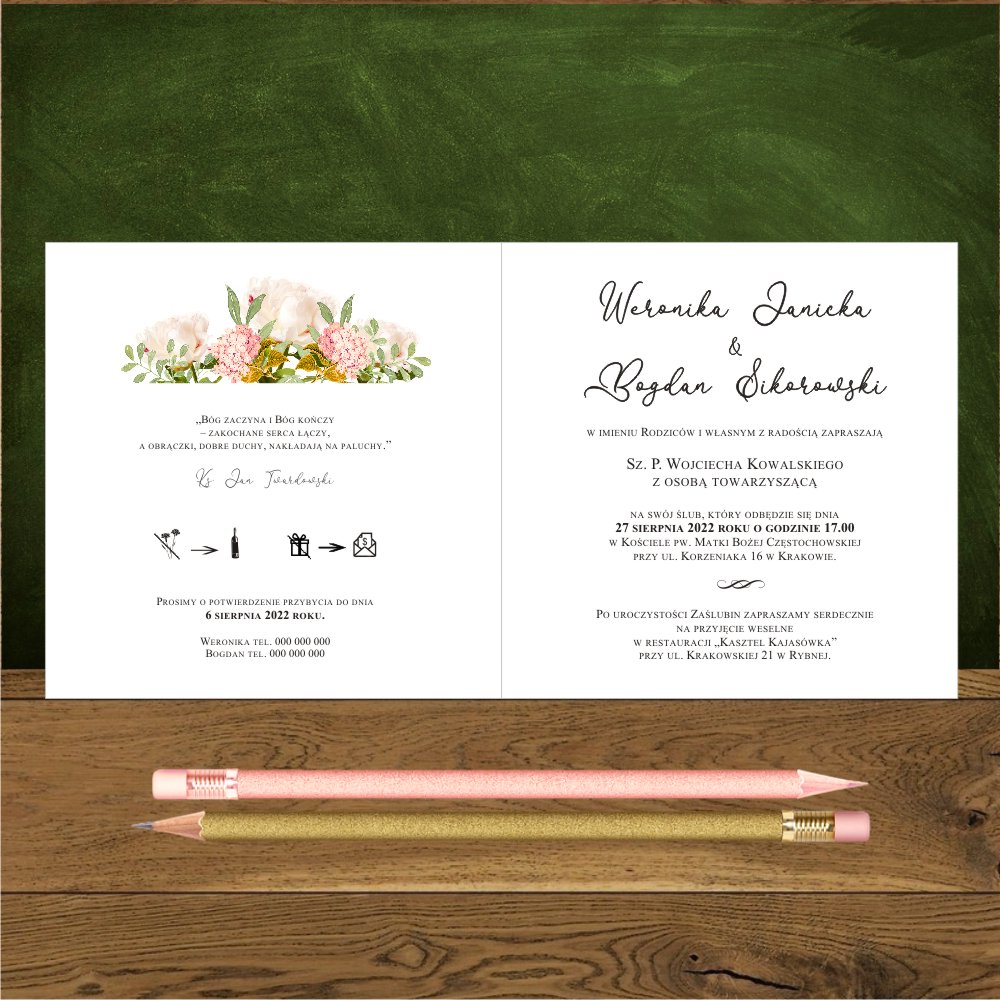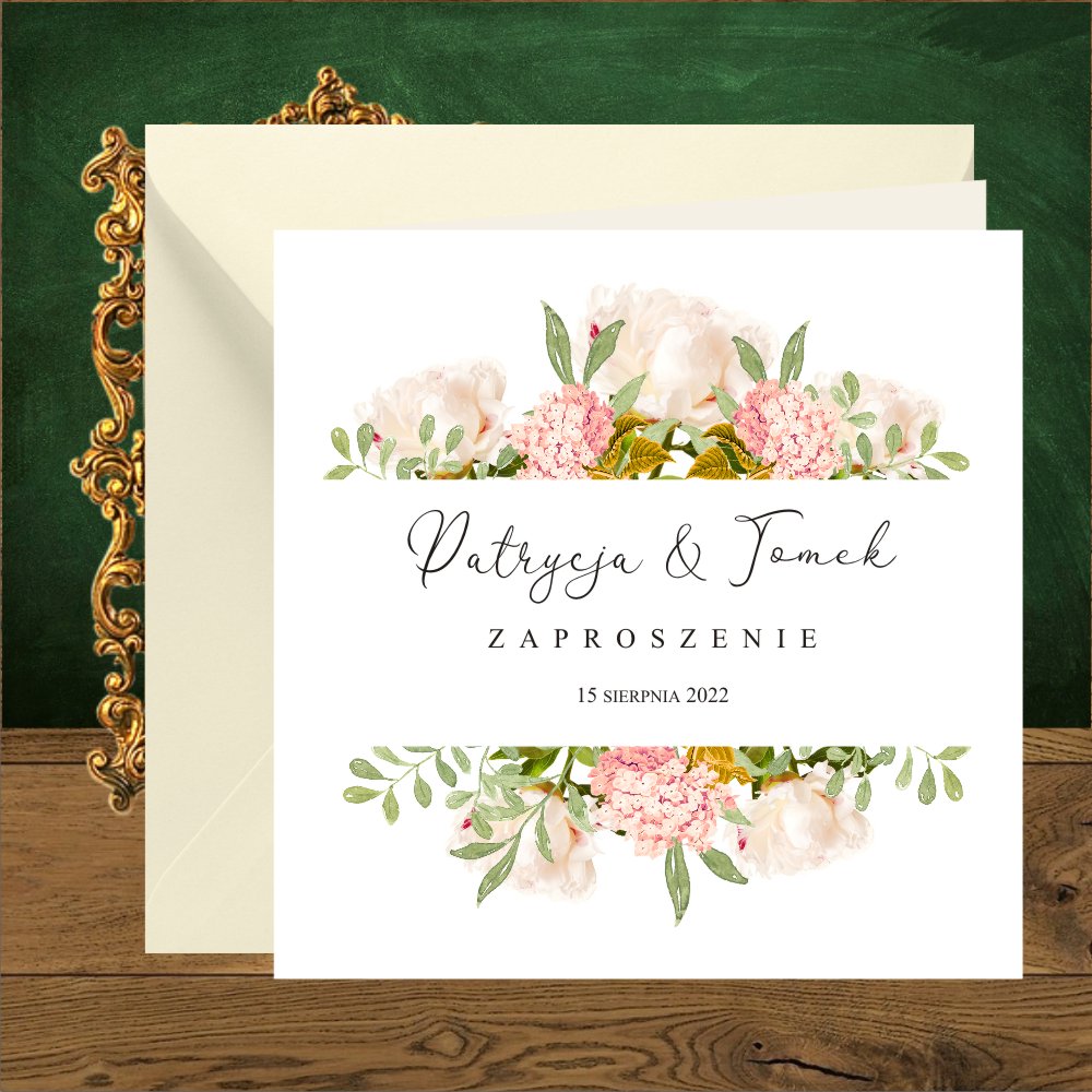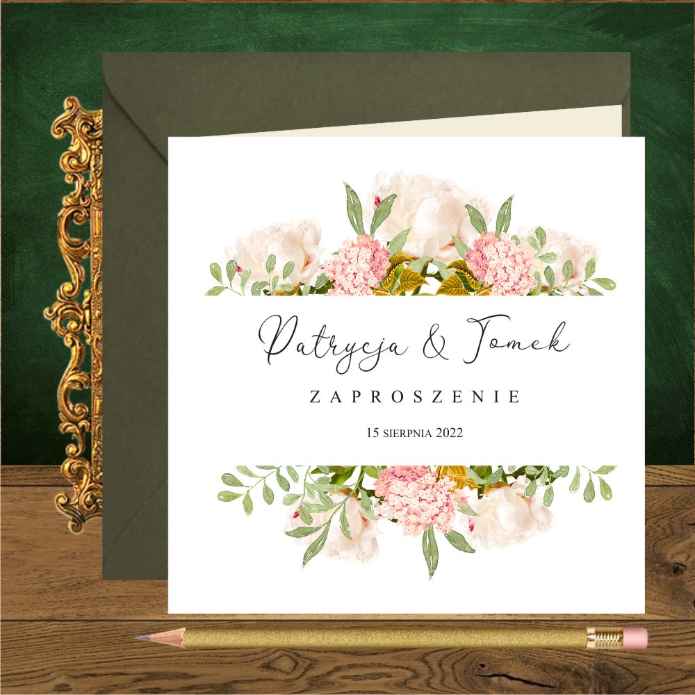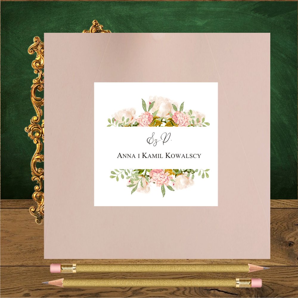 Zaproszenia na ślub i wesele z pastelowymi kwiatami. Kwadratowe, proste. Kwiaty romantyczny ogród