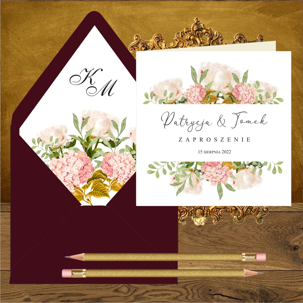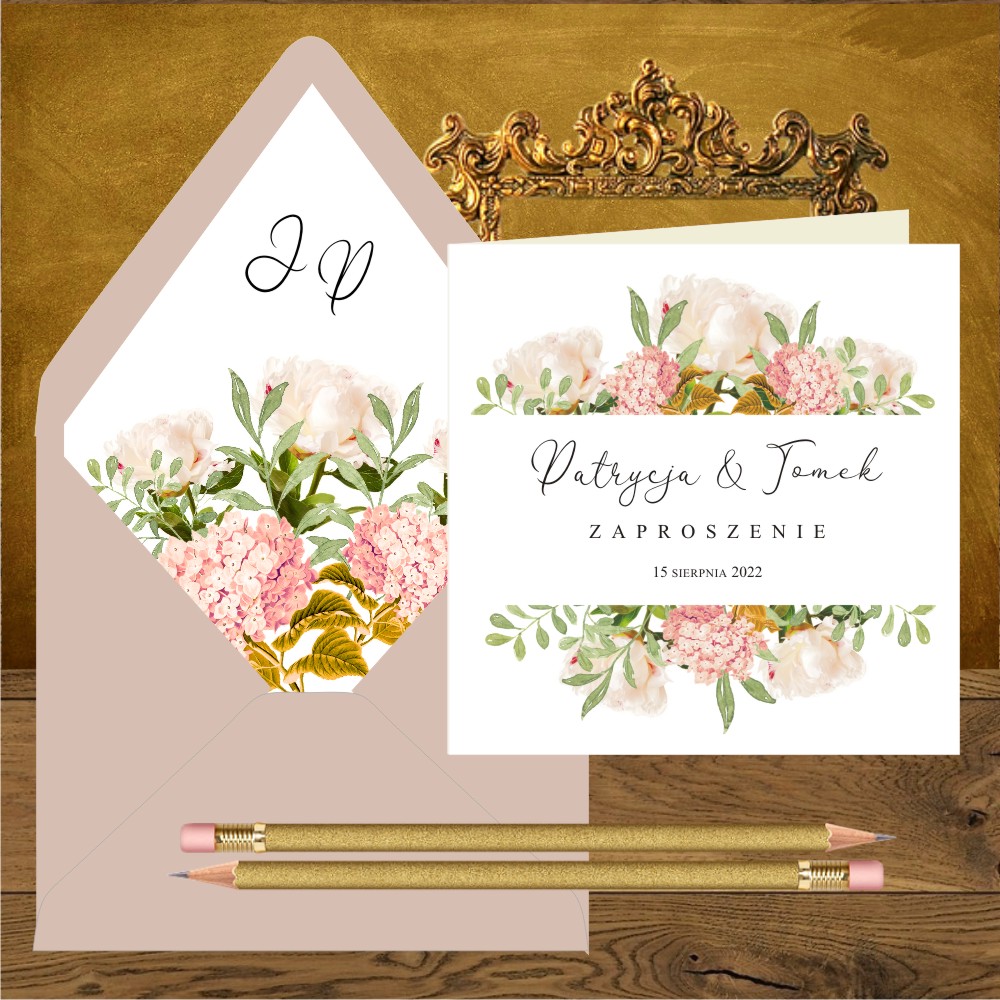 Różowe kwiaty w eleganckich zaproszeniach idealnie wpasują się romantyczny styl wesela. Piwonie i hortensje na sali i w dodatkach ślubnych, menu, zawieszkach na alkohol oczarują gości.