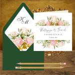 Zaproszenia weselne w stylu romantycznym z elementami boho z motywem kwiatów w kolorze pastelowego różu i chłodnego ecru. Hitem nowego sezonu ślubnego są pastele w różnym stopniu nasycenia barwą. Kwiaty poprzeplatane zielonymi gałązkami tworzą piękną kompozycję. Zaproszenia są wykonane z pięknego papieru, na odwrocie zaproszenia ślubnego mamy stylowy monogram. Możliwa jest personalizacja plecków tego zaproszenia specjalnie do koperty transparentnej. Fantazyjna czcionka nadaje zaproszeniom nowoczesności. Do wyboru koperty w kolorze pastelowego różu, pięknej nasyconej zieleni , biała, ecru, złota, bordo. Szczególnie pięknie prezentuje się z koperta bordo, złota i różowa nadając zaproszeniu elegancji. Zaproszenie może być personalizowane w środku lub na kopercie.