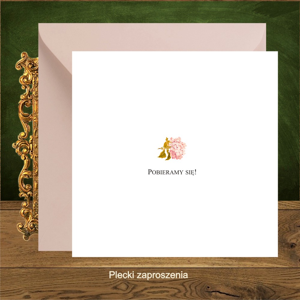 Zaproszenia ślubne boho na złotym kartoniku, kwadratowe. Wianek kwiaty bordo