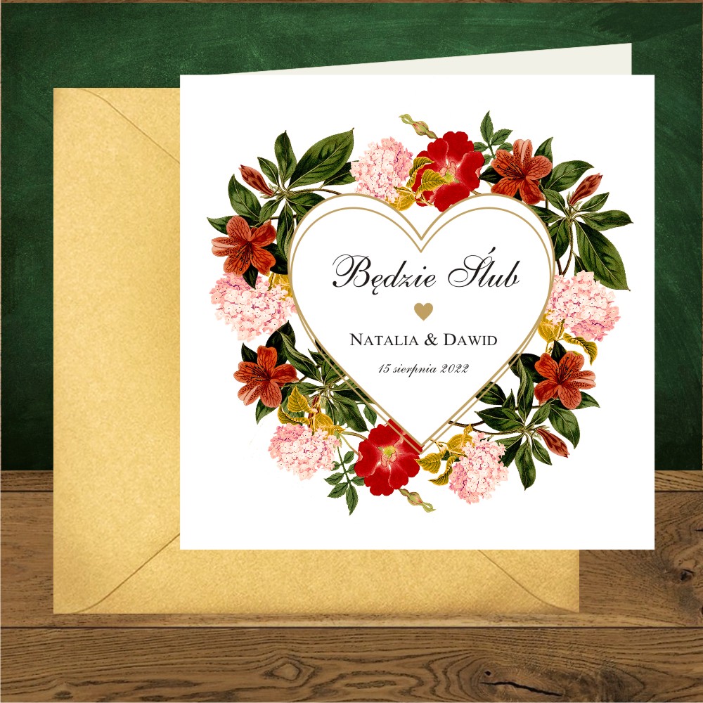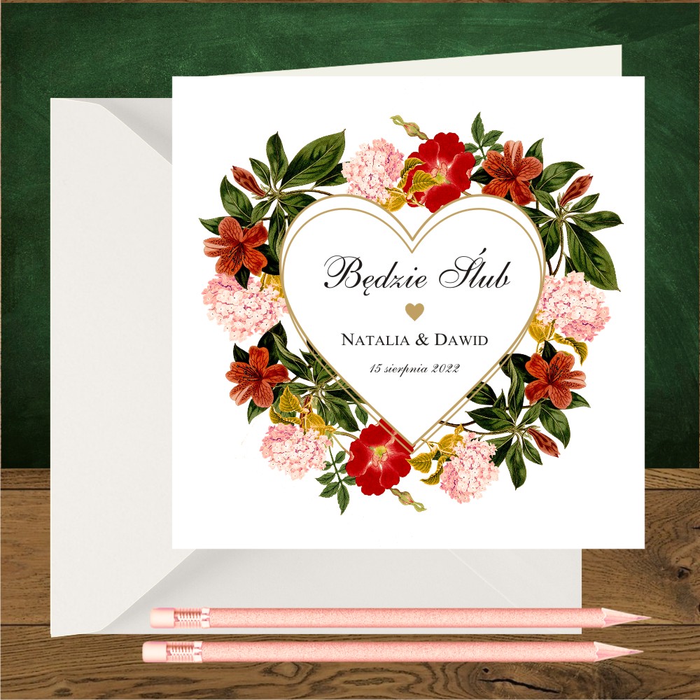 Zaproszenia ślubne boho -kwiaty bordo i serce