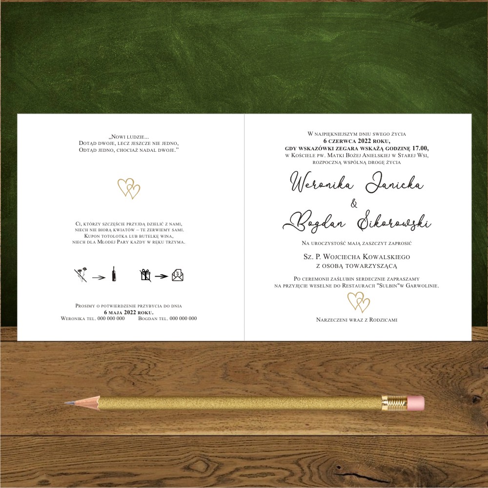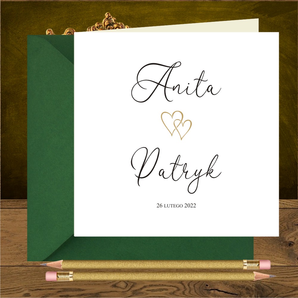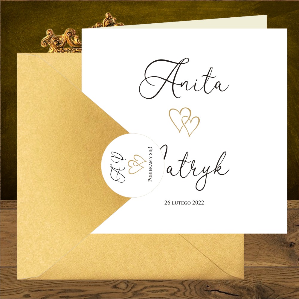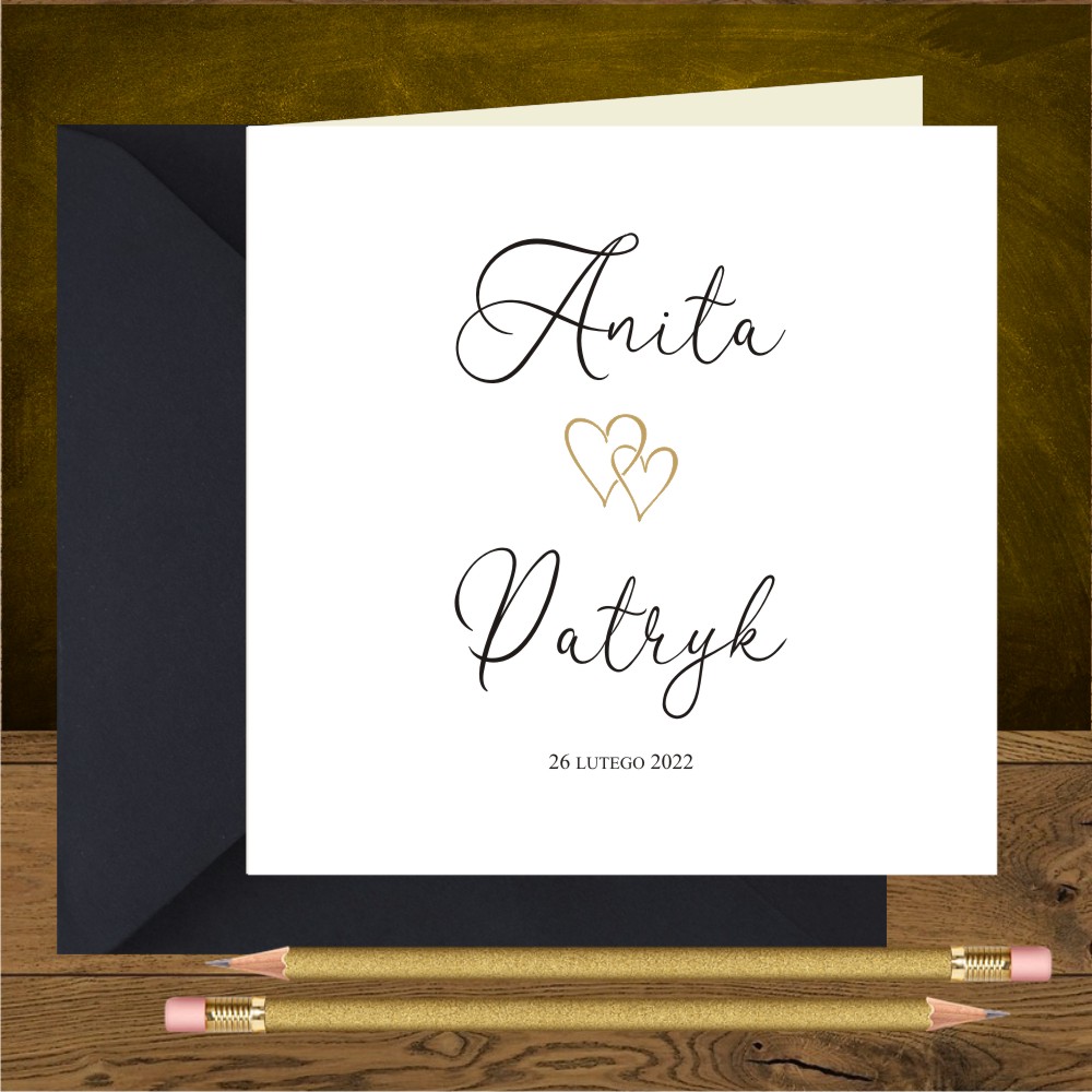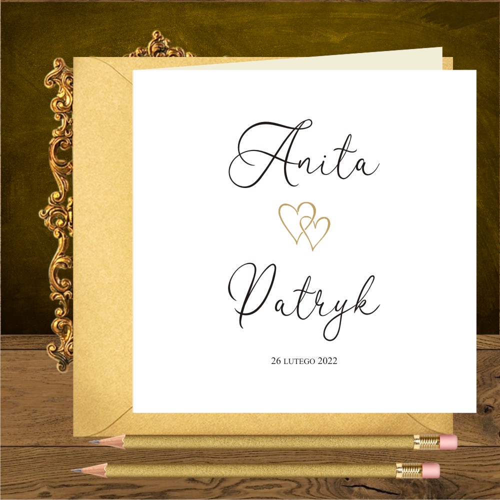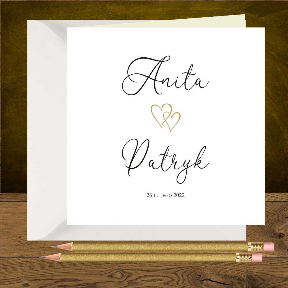 Zaproszenia ślubne minimalistyczne z dwoma złotymi serduszkami