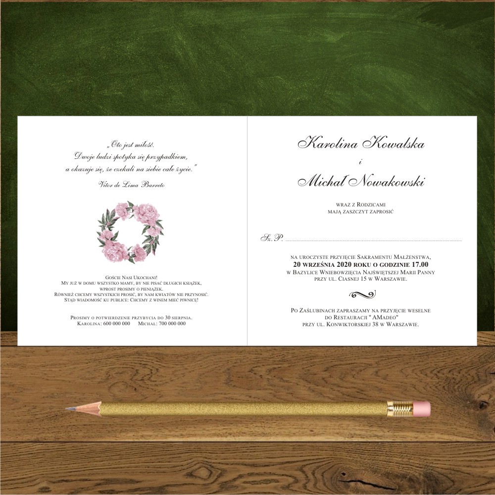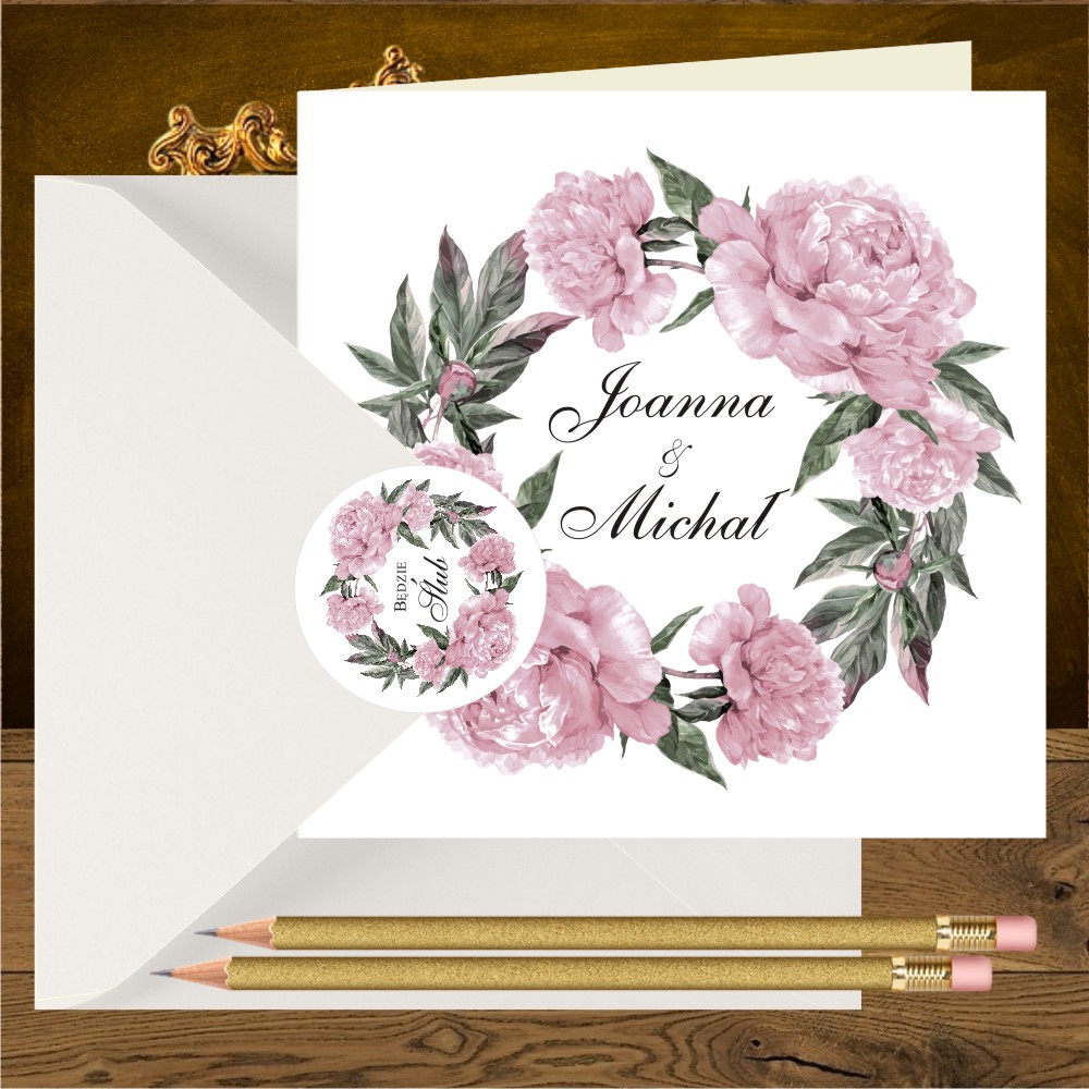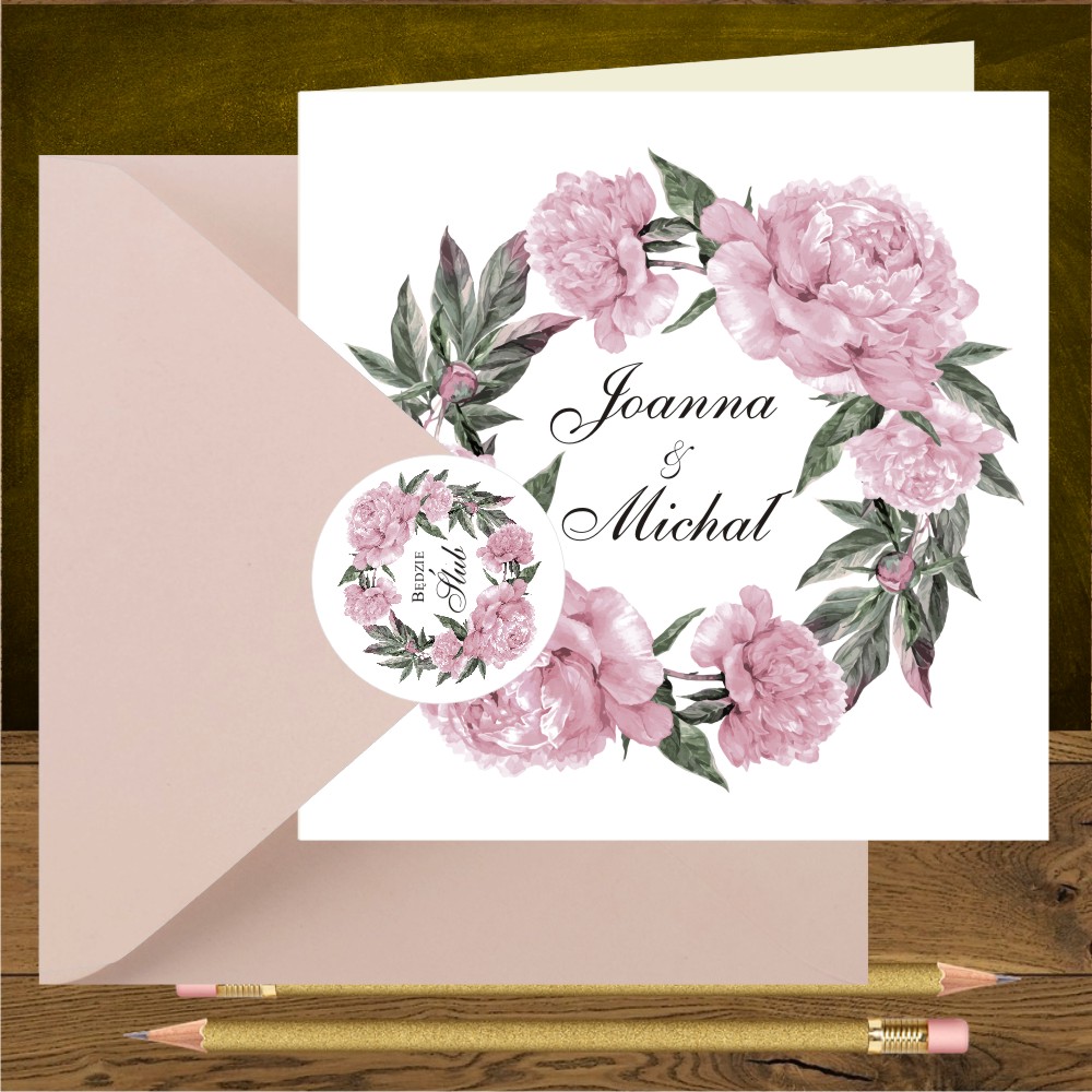 Zaproszenie wykonane na białym papierze. Na różowe peonie ułozone w kształt wianka. Całość utrzymana w delikatnej pastelowej stylistyce.