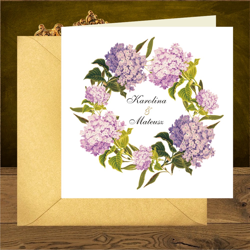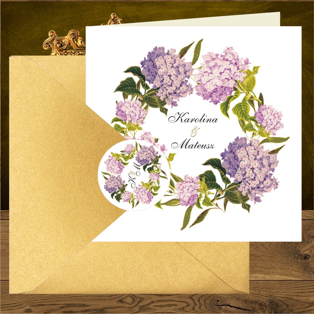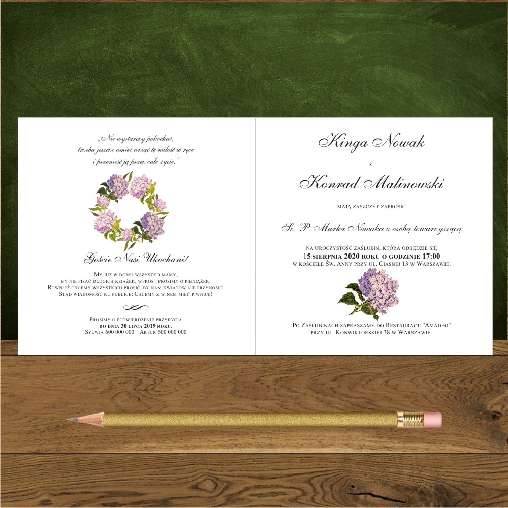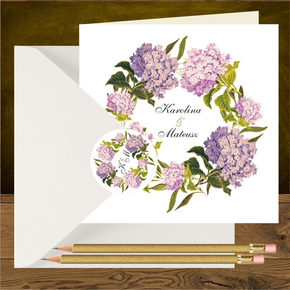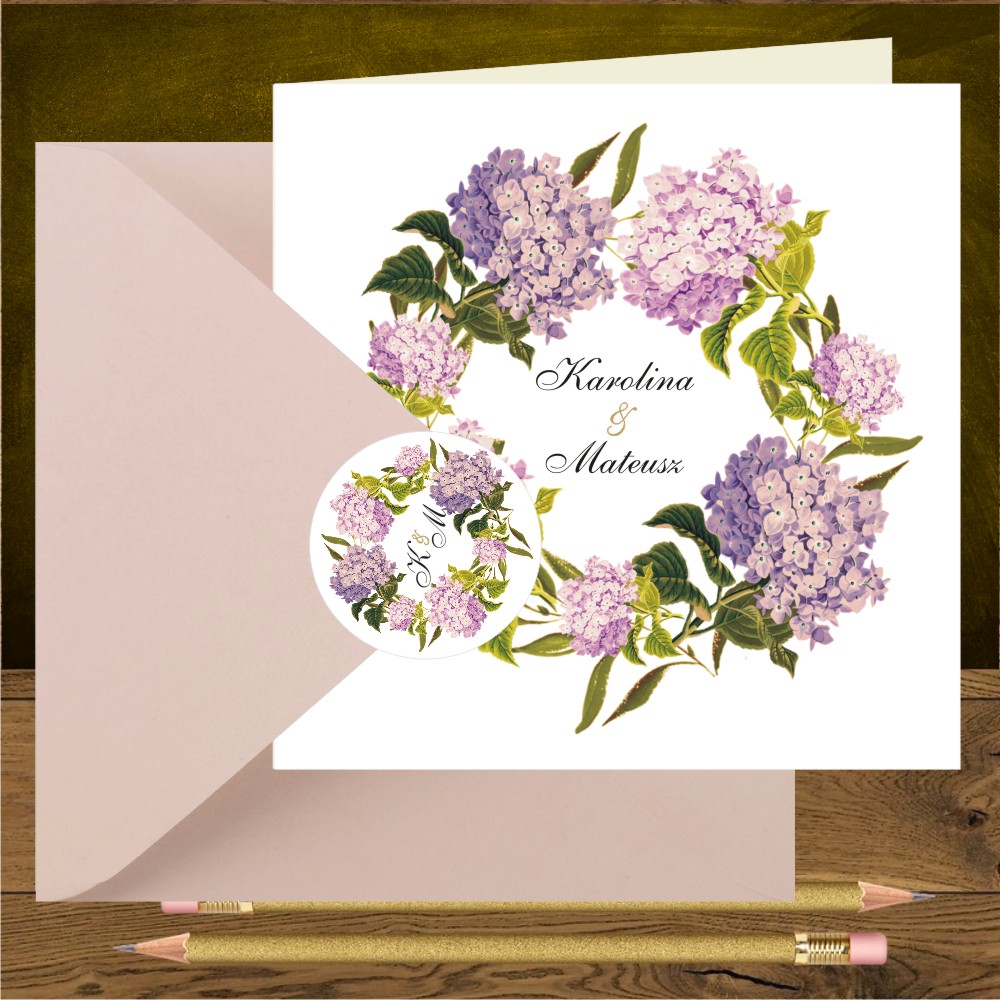 Zaproszenia na ślub z różowymi hortensjami w wianku