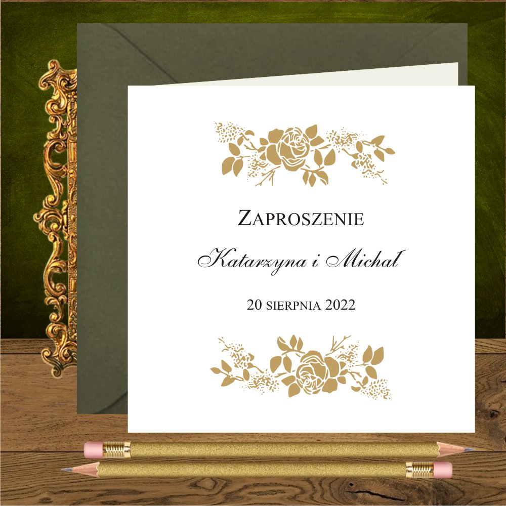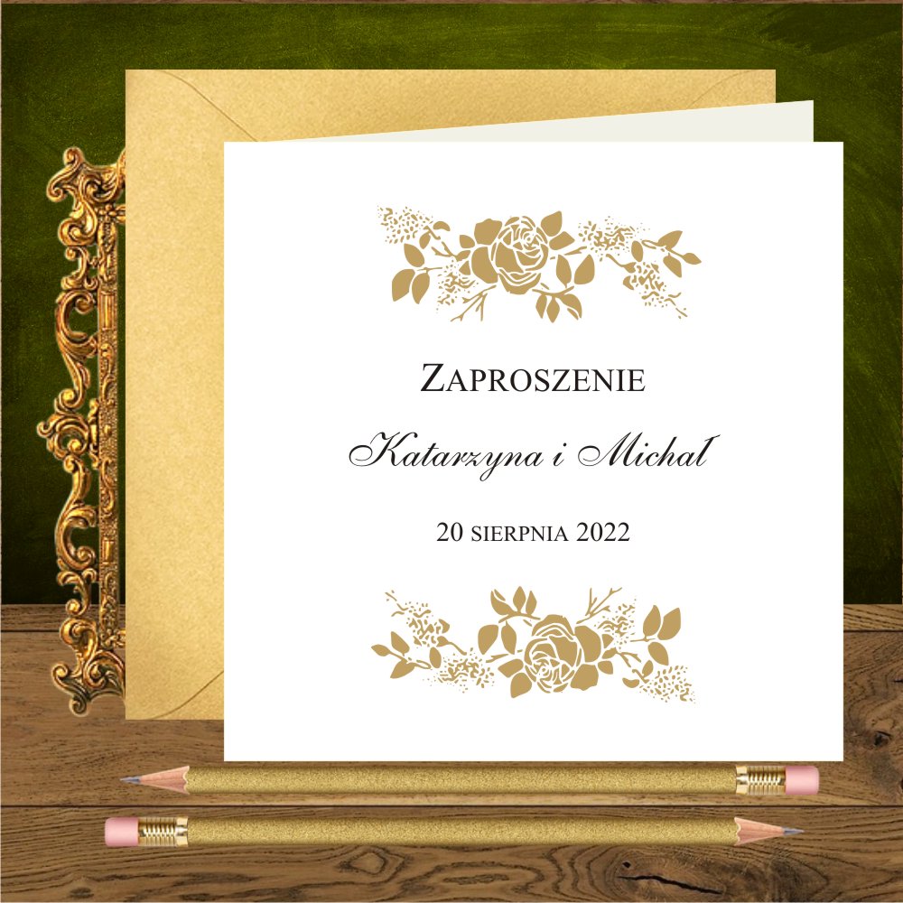 Zaproszenia na ślub ze złotymi różami. Proste, kwadratowe. Róże złote