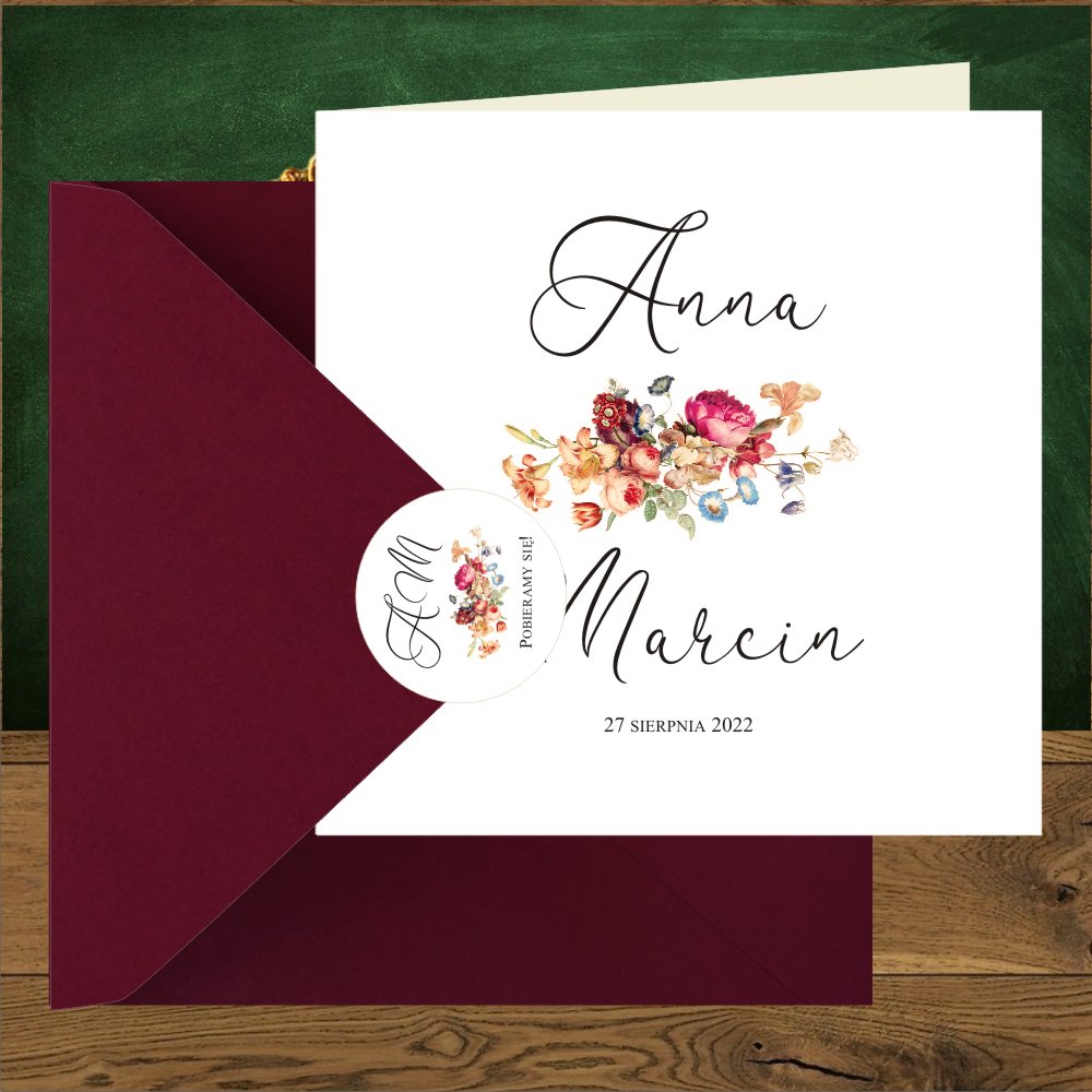 Zaproszenia bordowe kwiaty to elegancki motyw ślubny, pasujący do winietek, menu oraz ozdobnych bordowych kopert ślubnych. Przy ślubach boho to strzał w dziesiątkę.
