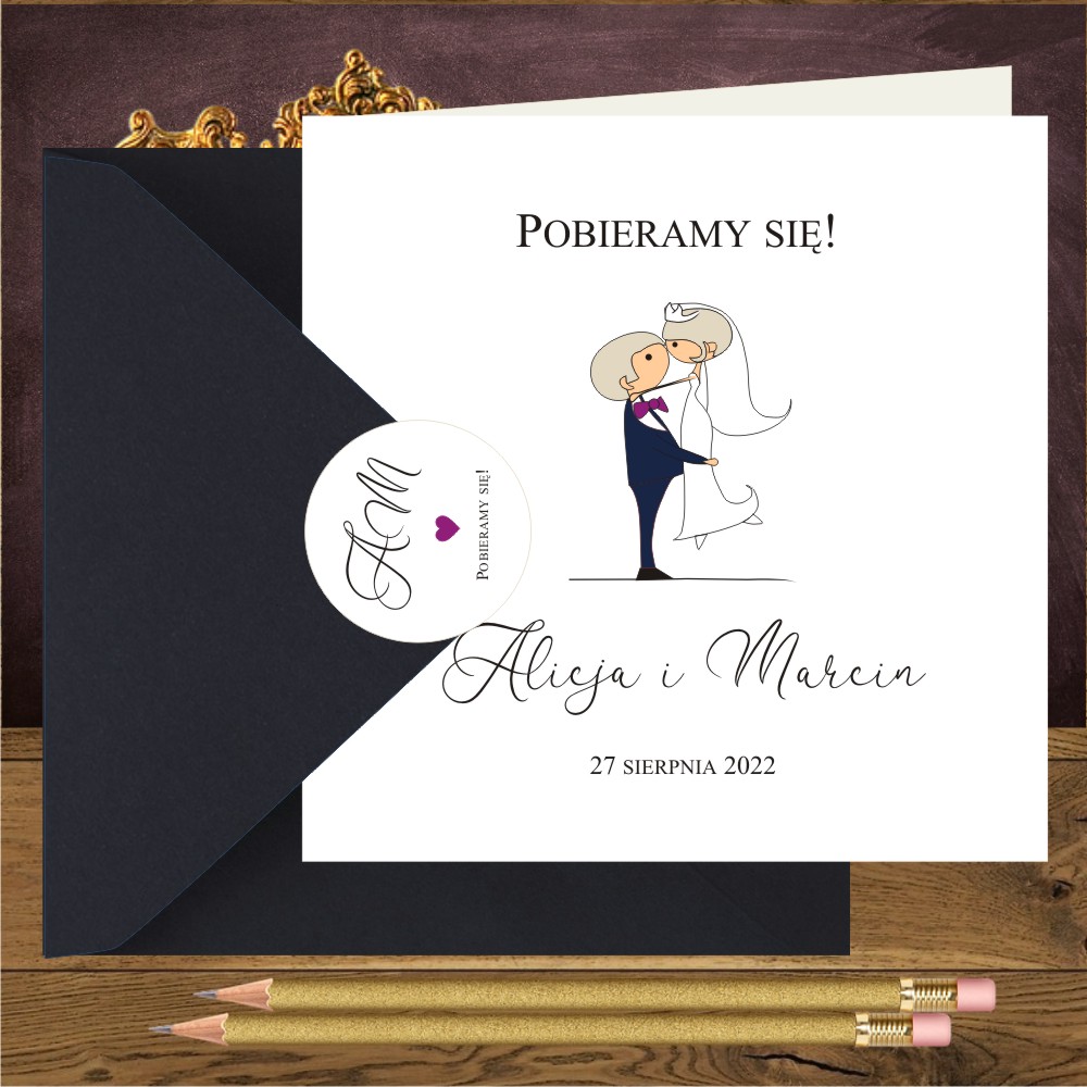 Zabawna grafika dodaje uroku, Pan Młody w granatowym garniturze i fioletowej muszce. Na kopercie możliwa personalizacja lub naklejka w kształcie kółeczka z inicjałami Państwa Młodych i fioletowym serduszkiem. Zaproszenia idealne na ślub w kościele i tylko na ślub cywilny.