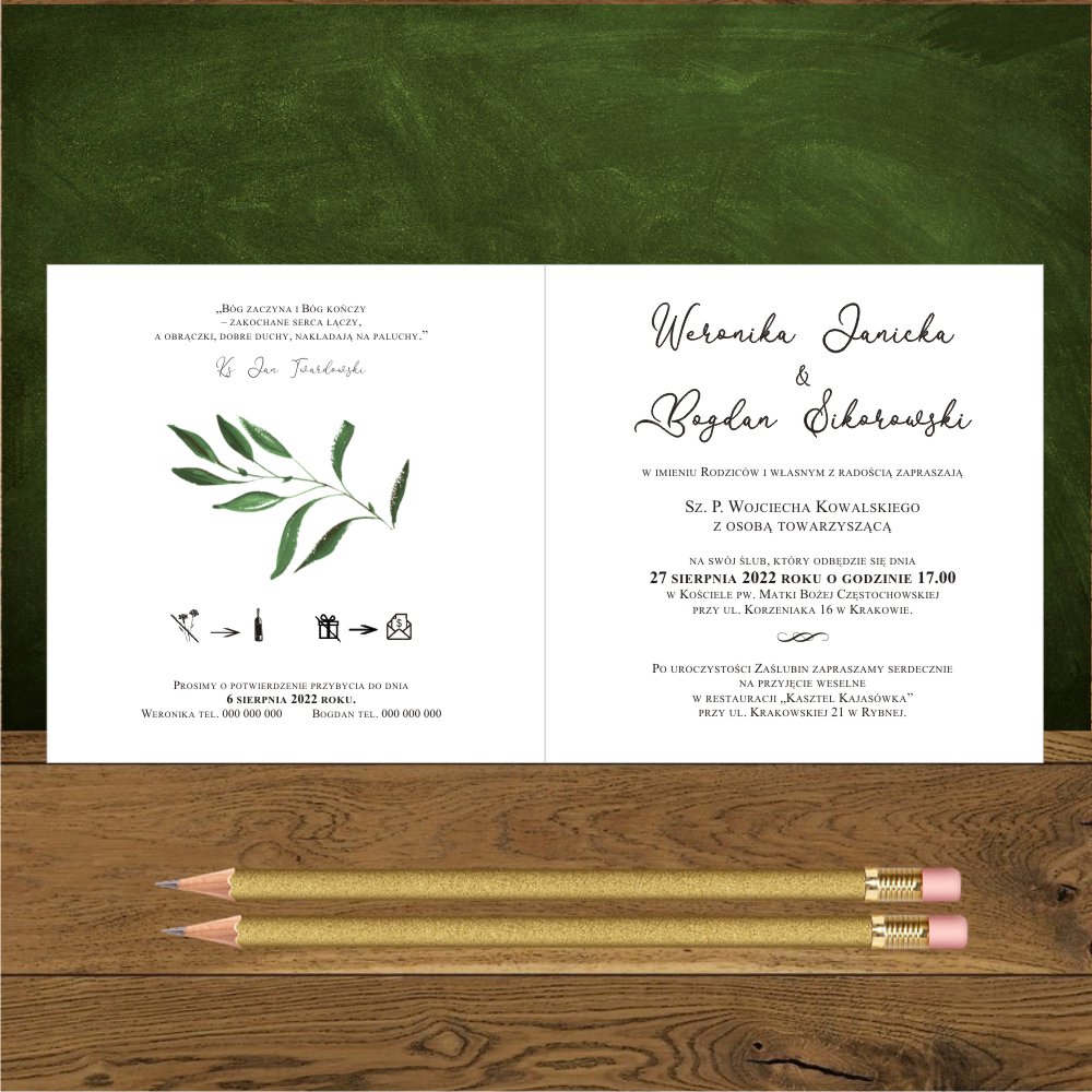 Zaproszenia na ślub rustykalne z jedną gałązką. Zielone gałązki delikatne