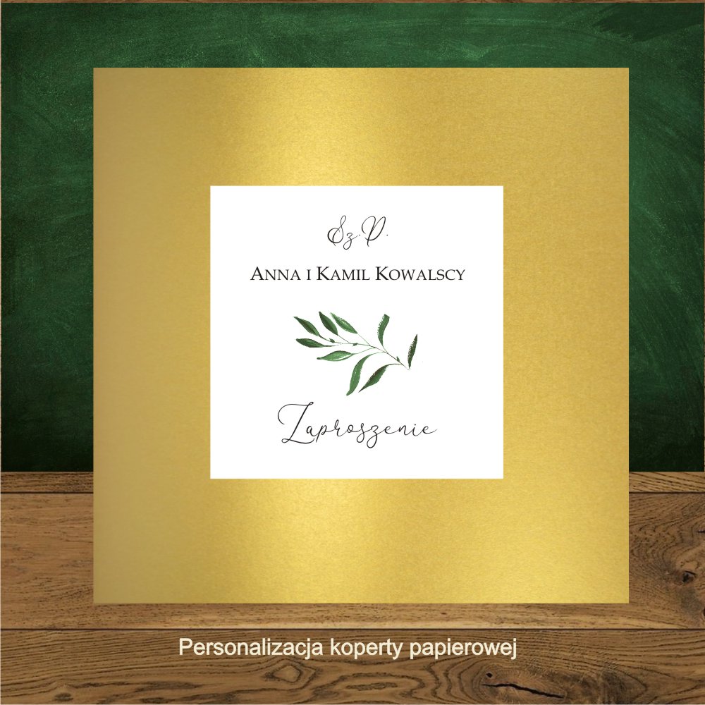Zaproszenia ślubne rustykalne z zielonymi gałązkami. Kwadratowe proste. Fantazyjna czcionka. Zielone galązki delikatne