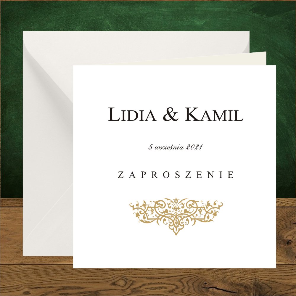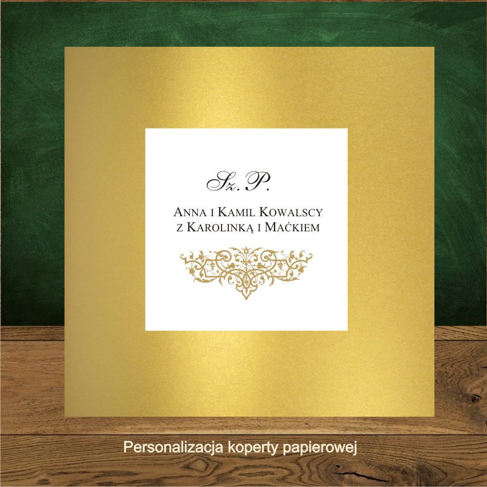 Zaproszenia ślubne z ornamentem złotym, proste, kwadtatowe. Oliwia złota
