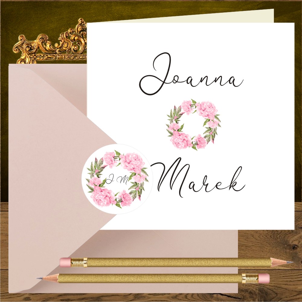 Piękne zaproszenie na wesele z różowymi piwoniami w wianku z nowoczesną ozdobną czcionką. Na pleckach zaproszenia inicjały i wianuszek kwiatów piwonii. Wyjątkowo korzystnie to kwiatowe zaproszenie przezentuje się z różową kopertą tworząc romantyczny styl.