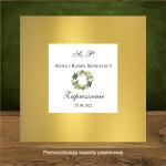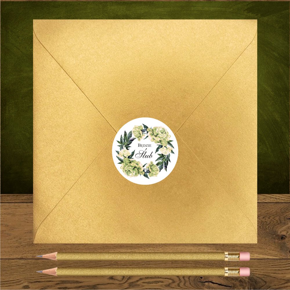 Naklejka na kopertę w kształcie kółeczka. Wykonana z papieru takiego jak użyty w zaproszeniach. W przykładzie koperta w kolorze butelkowej złota |