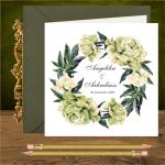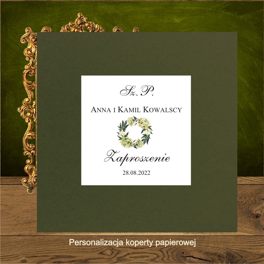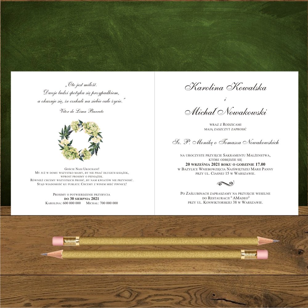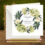 Opis: zaproszenie wykonane z bialego papieru. Na okladce imiona Państwa Młodych, data i grafika z motywem piwonii w kolorze ecru ułożonych w kształt wianka.