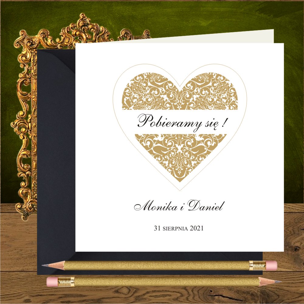 Zaproszenia ślubne z sercem, proste kwadratowe. Serce złote