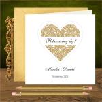 Zaproszenia ze złotym sercem w kolorze złotym wykonane na białym papierze. Serce pokryte jest ażurowym ornamentem. Zaproszenie może być personalizowane w środku lub na kopercie.